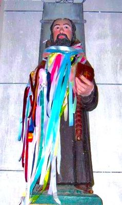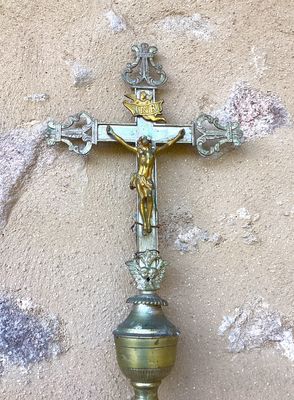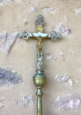Cette croix de procession fleurdelisée est en métal. Au centre du croisillon se trouve un Christ en croix, les bras relevés, et au-dessus de sa tête un ange porte le titulus INRI. Sur le fût figurent également deux anges ailés. Le pommeau est simple et la hampe en bois. On se rendait en procession à la croix de Châtenet-le-Vieux le 29 septembre, en portant la statue de saint Silvain ornée de ses rubans. La statue conservée dans l’église est datée du XVIIᵉ siècle. À Saint-Silvain-sous-Toulx, il existe une tradition très ancienne autour de la statue de saint Silvain, dite « habillée de rubans ». On y attachait des rubans de soie ou de tissu coloré, bénis, qui avaient une valeur à la fois protectrice et votive. Ces rubans étaient parfois décousus ou découpés en morceaux, puis conservés dans les maisons ou les étables afin d’éloigner la maladie, l’orage ou les accidents.